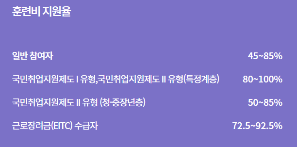 국민내일배움카드를 신청하는 자에게는 기본 300만 원의 훈련비가 지원되고 일부 대상자에게는 최대 500만원 한도 내에서 훈련비의 45% ~ 85%의 금액이 지원됩니다. 이는 수강하는 직종의 평균 취업률과 수강자의 소득수전에 따라 훈련비 자부담을 차등해서 부과하는 방식으로 지원율은 아래 사진을 참고하시면 됩니다.