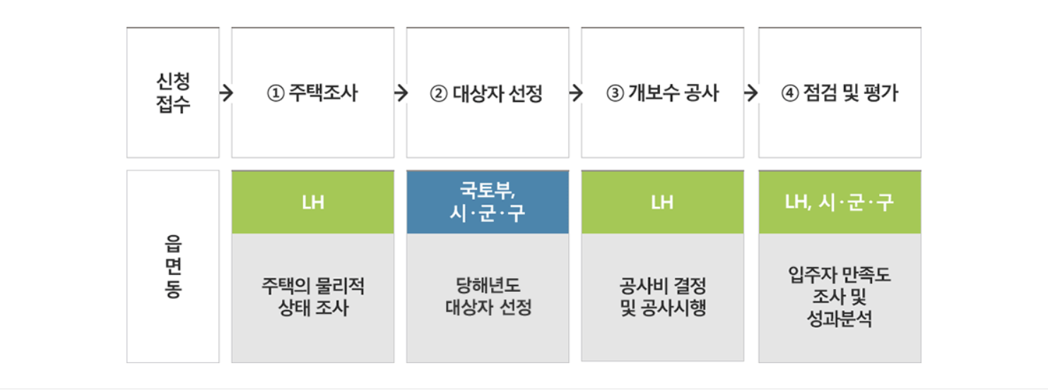 주택 등을 소유하고 그 집에 거죽하는 자가가구에게는 구조안전, 설비, 마감 등 주택의 노후도를 평가하여 종합적인 주택개량을 지원합니다. 또한 장애인 및 고령자(만 65세 이상)에 대해서는 주거약자용 편의시설(장애인 380만 원, 고령자 50만 원 한도)을 추가로 설치할 수 있습니다. 혹서기 대비와 수급자 주거환경 개선을 위하여 보수범위별 지원금액 이내에서 냉방설비와 입주청소, 소독까지도 지원된다고 하며 지원 절차는 아래와 같습니다.