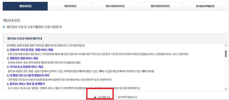 주민등록등본을 온라인으로 발급받는 경우 개인(내국인), 개인(외국인), 법인사업자(내국인), 법인사업자(외국인) 등으로 구분되어 있으며, 발급받고자 하는 해당 부분을 선택한 후 개인정보 수집 및 고유식별정보 수집 이용동의와 고유식별정보 수집에 대한 안내에 동의 후 확인을 클릭합니다.