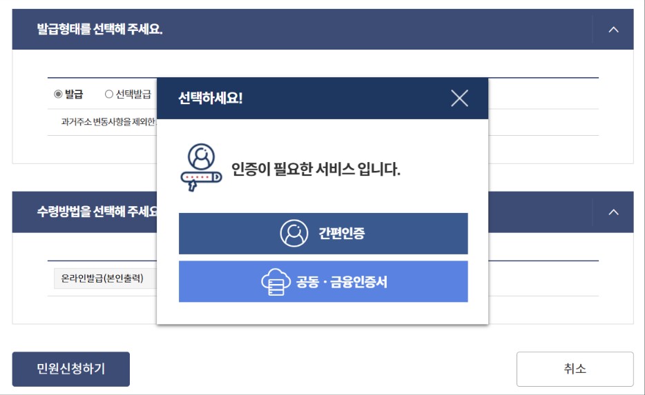 비회원 신청하기를 하는 경우 간편인증간편 인증 또는 공동인증서, 금융인증서로 인증 후 발급이 가능합니다. 주민등록등본을 발급받기 위해서 비회원 신청하기 버튼을 누르면 간편 인증과 공동인증서, 금융인증서 중 1가지를 선택하여 인증을 진행하면 신청이 모두 완료됩니다. 이후 문서출력 버튼을 눌러 출력하기만 하면 됩니다.