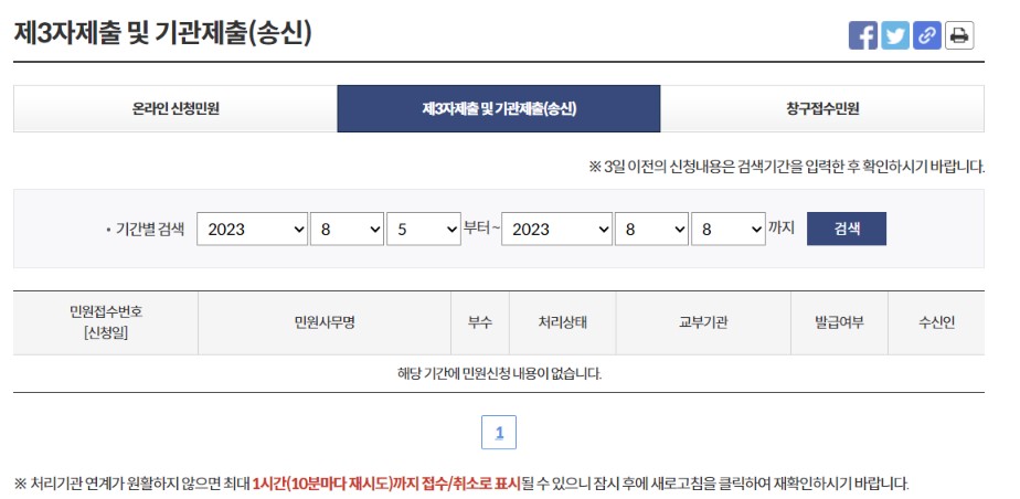 주민등록등본을 제3자제출한 경우 나의 민원현황에서 제3자제출 및 기관제출(송신)이 제대로 전송되었는지 여부와 진행상황도 확인이 가능합니다. 처리가 원활하지 않은 경우 10분마다 새로고침을 하면 접수여부가 상시 업데이트 된다고 합니다.
