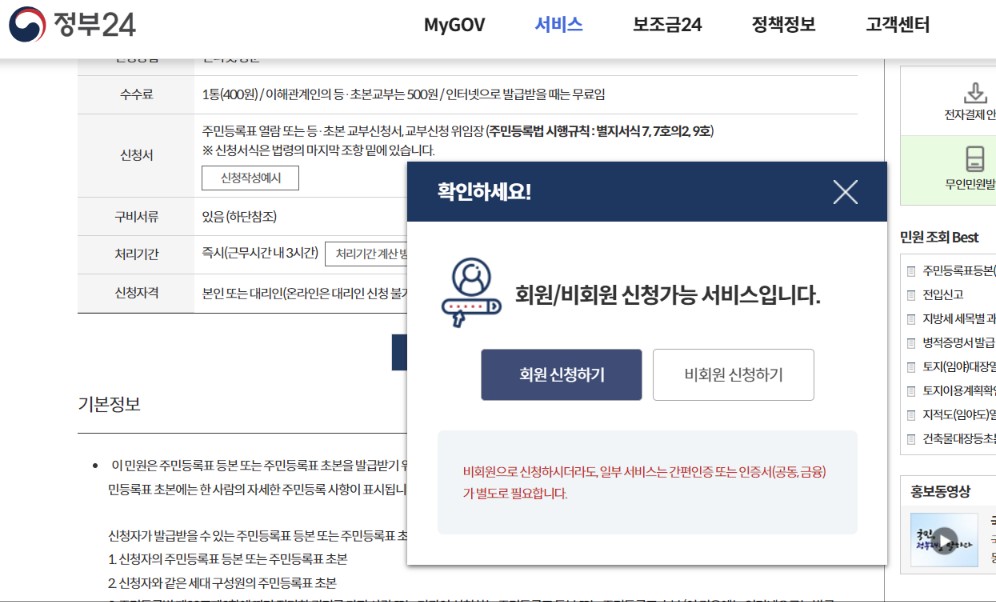 주민등록등본의 온라인 발급센터인 정부24에 접속하여 주민등록등본을 발급받고자 한다면 회원신청과 비회원 신청 중 선택할 수 있습니다. 회원가입의 경우 한 번 가입하면 아이디와 비밀번호만 기억하면 매번 간편하게 로그인이 가능합니다. 다만, 자주 사용하지 않는 분들은 회원가입을 하는 절차가 번거로우실 수 있으니 굳이 회원가입을 하지 않아도 발급이 가능합니다. 저는 비회원으로 주민등록등본을 신청하는 방법을 안내드리겠습니다.