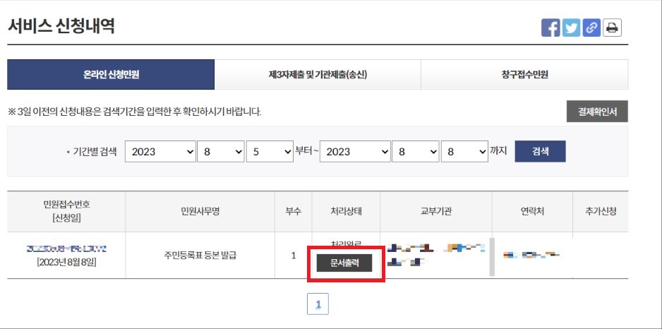 출력하기 버튼을 누르면 신청한 등본의 정보가 보여지며 출력이 가능합니다. :)