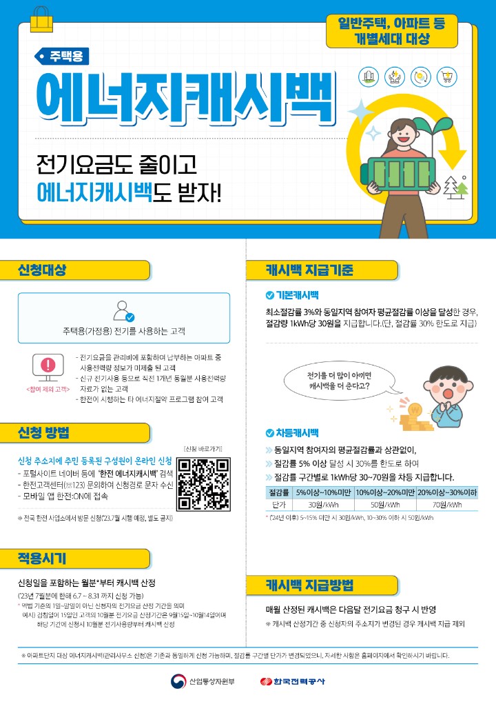 전기사용량을 줄이면 절감량에 비례해서 한전에서 전기요금을 1kWh당 최대 100원까지 할인해 준다는 사실 알고 계신가요? 지난겨울 난방비 폭탄으로 관리비의 부담감을 팍팍 느끼셨던 분들 많으시죠? 올여름은 비도 많이 오고 정말 더운 여름이 될 거라는 예측이 많아 에어컨 사용에 부담감 많으셨죠? 오늘 주택형 에너지캐시백 신청하시고 한달에 최대 약 오만 원 전기요금 아껴보세요!
