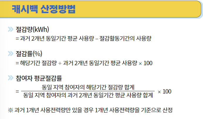 에너지캐시백의 절감량은 과거 2개년 동일기간 평균 사용량 대비 절감활동기간의 사용량의 차이로 계산됩니다. 그 절감량에 과거 2개월 동일기간 평균 사용량은 나누어 절감률이 계산됩니다. 아래 산정방법 사진에서 상세한 계산방법을 확인할 수 있습니다.