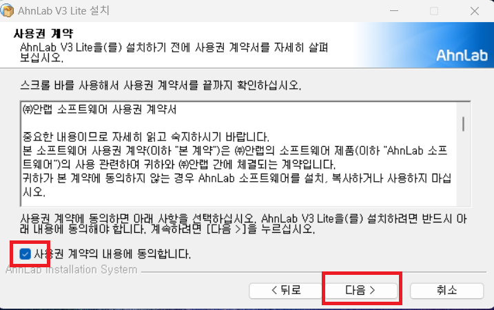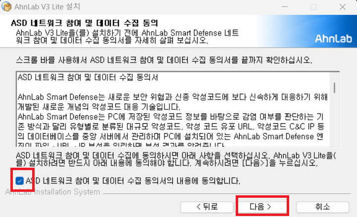 V3무료백신 설치 주의사항을 읽고 다음 버튼을 누르면 V3무료백신 사용권 계약의 내용과 ASD 네트워크 참여 및 데이터 수집에 동의를 해야 합니다.