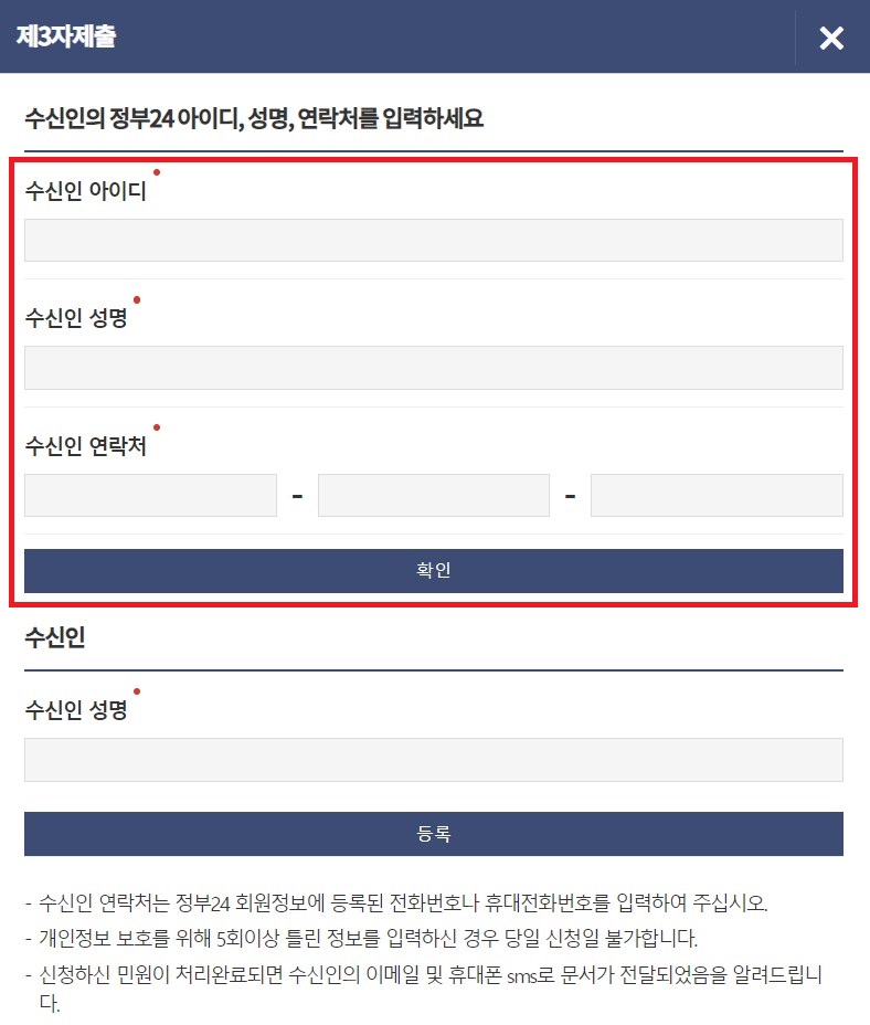 주민등록등본을 제3자에게 제출하기 위해서 수령방법을 온라인발급(제3자제출)로 선택 후 민원신청하기를 누르면 수신인의 정부24 아이디, 성명, 연락처를 입력하는 창이 새로 뜨게 되고 입력 후 확인만 누르면 신청이 완료됩니다. 신청한 민원이 처리되면 수신인의 이메일 및 휴대폰의 SMS로 문서가 전달되었음을 알림까지 해준다니 아주 편하게 신청이 가능하네요.