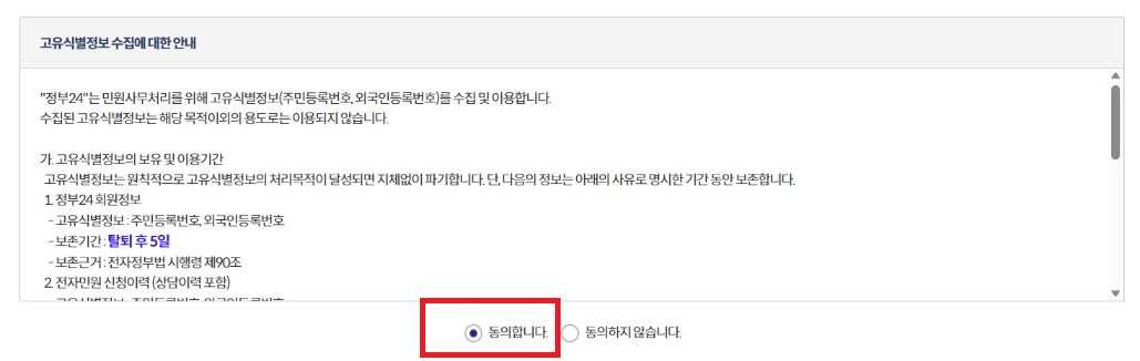 주민등록등본을 온라인으로 발급받는 경우 개인(내국인), 개인(외국인), 법인사업자(내국인), 법인사업자(외국인) 등으로 구분되어 있으며, 발급받고자 하는 해당 부분을 선택한 후 개인정보 수집 및 고유식별정보 수집 이용동의와 고유식별정보 수집에 대한 안내에 동의 후 확인을 클릭합니다.